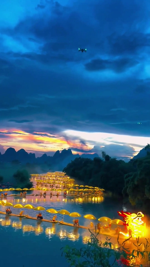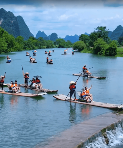 In the morning,drive to the pier, take three-star cruise on the Li River from Guilin to Yangshuo, explore West Street, and stroll along the Yulong River Bamboo rafting to enjoy the beautiful scenery.