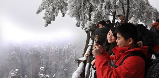 Some tourists in Hong Kong happily took pictures of the beautiful snow-covered landscape in Tianzi Mountain of Zhangjiajie Wulingyuan Scenic Area on December 30. The last snow of 2012 made Zhangjiajie look especially enchanting and attracted thousands of tourists from home and abroad to enjoy the snow and take pictures.