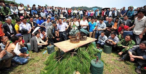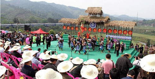 People gather to watch performance during the Dawuliang Singing Festival, also the Culture Festival of the Dong Ethnic Group, in Yatunbao Township of the Tongdao Dong Autonomous Prefecture, central China's Hunan Province, April 17, 2013. Many people from south China's Guangxi Zhuang Autonomous Region and southwest China's Guizhou Province specially came to the festival so as to make friends with their voices and participated in traditional activities like catching fish and performing Lusheng dance. The festival was listed as the intangible cultural heritage of the Hunan Province in 2006.