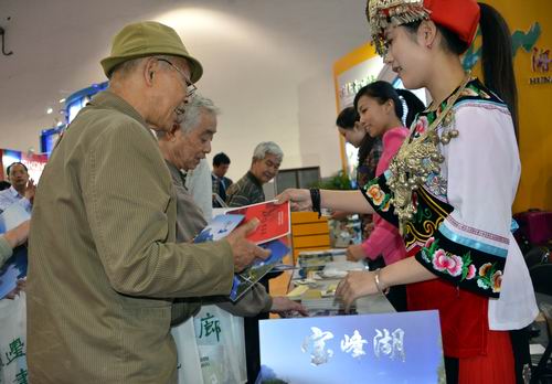 People from different places of Guiyang are keeping flocking into Travel Fair of Guiyang International Fair Center. An old couple, stepping in front of Zhangjiajie display area, excitedly talk their travel experience in Zhangjiajie with the sales staffs from Zhangjiajie.