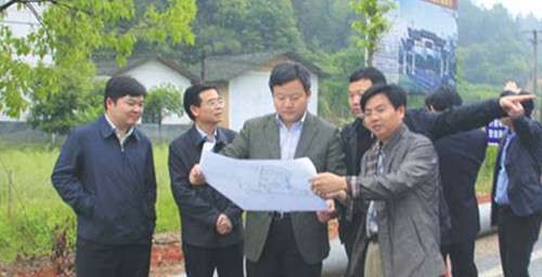 Cao Lijun (second from right), Party chief of Liuyang, known as China's firework capital, inspects a project site on Dawei Mountain. Photos Provided to China Daily