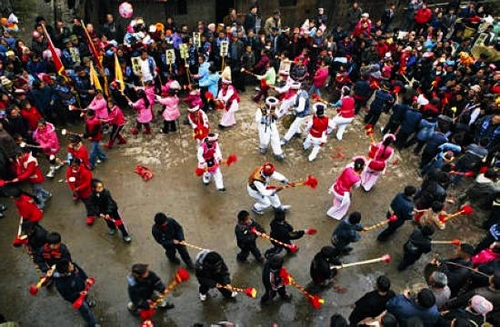 Long long ago,Bai Nationality in Sangzhi,Zhangjiajie were in disadvantaged position,thus Bai people made efforts to improve and strengthen their position by learning martial arts.Gradually,this kind of martial arts was evolved into dance. Women and men usually danced together and past this tradition on from generation to generation .When dancing, the dancer holds a long stick with a length of about 2 meters.Both tips of the stick are as big as a bowl,but its middle part is very suitable for clench. Being bold and unconstrained,Bai people prefer to dancing whenever and wherever if pleased.And the dance movements are of variety.There are mimics of monkeys climbing,rabbits glaring at the moon,warriors waving sword and so on.During the plough period,Bai people can dance Battle Drum dance with any farm tools in hand.