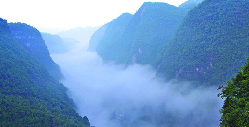 A cloud of mist over heavily forested Wulong Mountains.