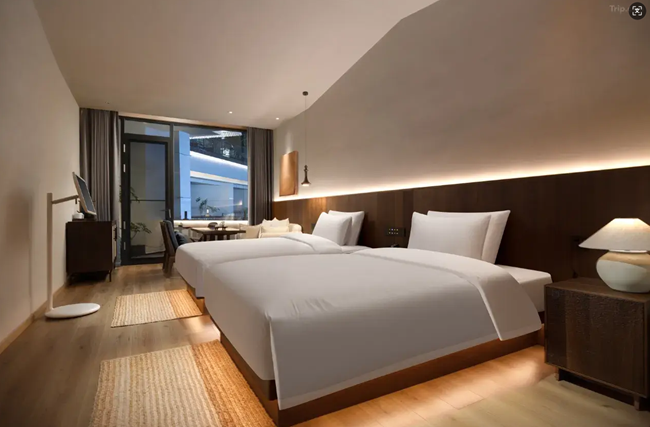 The hotel's ambiance is often described as warm, cozy, and aesthetically pleasing, blending modern aesthetics with traditional Chinese style. The presence of resident cats adds charm and homeliness to the environment.