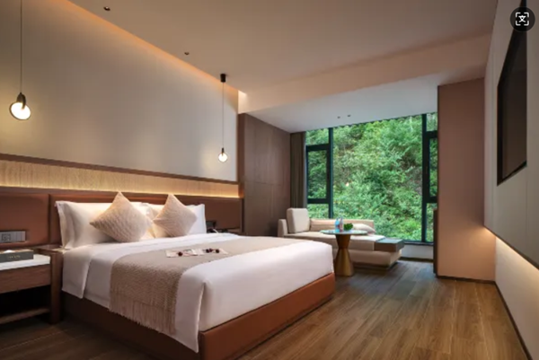 The hotel is located at the entrance of Baofeng Lake Scenic Area, the filming place of Zhangjiajie Wulingyuan Journey to the West, a few minutes' drive from the east gate of Zhangjiajie National Forest Park to Wulingyuan and the bus station, the hotel provides Chinese and Western breakfast, infinity swimming pool, conference room, gym, coffee bar, tea bar, laundry, barbecue area, supermarket, parking lot, clothes drying and other supporting facilities, implanting the life of people in the city into the depths of the mountain, enjoying the fresh breath of the mountainThe hotel is located in the hinterland of the transportation hub of Wulingyuan Scenic Area, Lotus Airport, West High-speed Railway Station and Bus Station can be reached by public transportation, and is also equipped with banks, hospitals, special snacks, bars, large shopping plazas and other supporting facilitiesThe hotel has hundreds of outdoor parking spaces, all rooms are equipped with intelligent voice system, intelligent toilet, minibar refrigerator, brand toiletries, chaise longue and laundry room ironing on the 6th floor, providing convenient conditions for your travelThe hotel provides sign door pick-up service, special afternoon tea, poolside bar drinks, butler itinerary customized service center, and all the staff of the hotel are waiting for your visit.