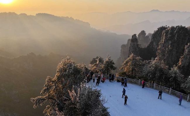 Affected by severe temperature drop, charming rime scenery appeared in the Tianmen Mountain Scenic Area of Zhangjiajie. The mountainous area draped with a cloak of snow was like a wonderland, attracting many tourists.